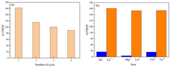 There are a lot of coexisting ions such as sodium, magnesium, copper, and calcium ions in waste water that may affect the adsorption of lanthanum ions. Hence, it is imperative to conduct an analysis of the selectivity of La3+ over Na+, Mg2+, and Cu2+ ions. The adsorption selectivity and recycling characteristics of tea tree shell activated carbon are shown in Figure 5. Figure 5a illustrates that after four cycles COSAC-Na2EDTA-15 still exhibits good recovery performance for lanthanum ions. In Figure 5b, it is evident that Na+, Mg2+, and Cu2+ exert minimal impact on the adsorption capacity of lanthanum ions. This observation suggests that COSAC-Na2EDTA-15 exhibits excellent ion selectivity.