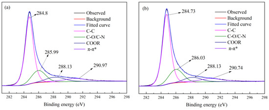 For a more comprehensive understanding of the La3+ adsorption mechanism on activated carbon surfaces, XPS was used to analyze the peak shift after La3+ adsorption on activated carbon. The C 1s peak was smoothed by a Gaussian function. Figure 7 is the C 1s peaks before and after the activated carbon adsorption of lanthanum ions. The C 1s spectrum of COSAC-Na2EDTA-15 prior to adsorption reveals four distinct peaks with binding energies at 284.8 eV (C-C), 285.99 eV (C-O/C-N), 288.13 eV (COOR), and 290.97 eV (π-π*). When La3+ was adsorbed, the binding energies of C-C, C-O/C-N in COSAC-Na2EDTA-15 were transferred to higher regions. Figure 7 shows that the energy of the C-O/C-N peak has elevated from 285.99 to 286.03 eV. These observations suggest that the C-C and C-O/C-N functional groups present on the surface of COSAC-Na2EDTA-15 establish coordination bonds with La3+, with the stable La3+ adsorption on the activated carbon surface.