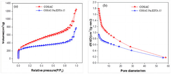The adsorption–desorption isotherms of N2: (a) pore size distribution; (b) COSAC and COSAC-Na2EDTA-15.