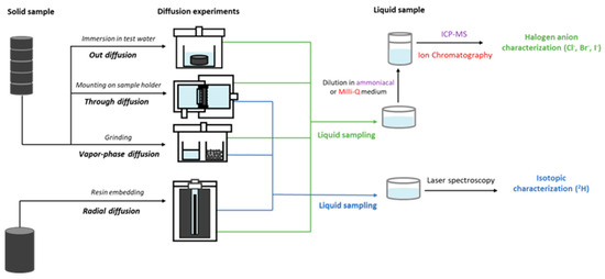- Savoye, S.; Michelot J luc Wittebroodt, C.; Altinier, M.V. Contribution of the diffusive exchange method to the characterization of pore-water in consolidated argillaceous rocks. J. Contam. Hydrol. 2006, 86, 87–104. [Google Scholar] [CrossRef] [PubMed]
