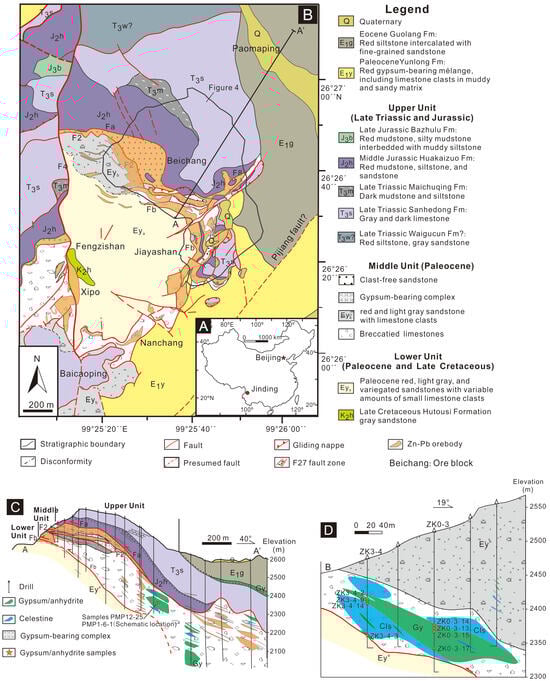 Geology of the Jinding dome (modified after [9,23]). (A) The location of Jinding deposit. (B) Geological map showing the geology and distribution of mineralization in Jinding dome. (C) Cross section (A-A′ section in (A)) of the Jinding open pit and the Paomaping ore block. (D) The geology and mineralization of the Baicaoping ore block and the locations of gypsum/anhydrite samples.