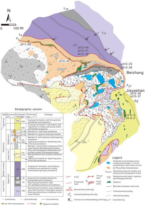 The Jinding Zn–Pb deposit is hosted within a tectonic dome consisting of Paomaping, Beichang, Jiayashan, Fengzishan, Xipo, Nanchang, and Baicaoping ore blocks (Figure 3A). Open pit comprises Beichang and Jiayashan and covers >90% of the Zn and Pb reserves in the deposit. A new geological mapping of the open pit divided the Jinding dome rocks into three main structural units: Lower, Middle, and Upper units, respectively [9] (Figure 4).