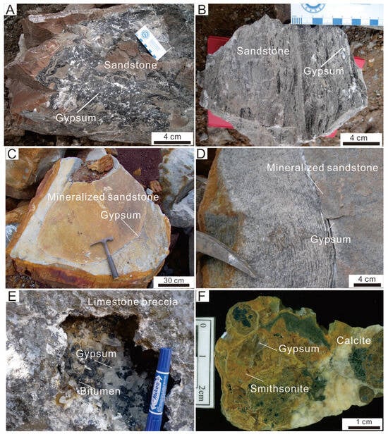 (A,B) Gypsum mixed with sand in Member III gypsum-bearing complex from the Middle Unit, the Beichang ore block. (C,D) Gypsum in Member IV clast-free pillow-shaped mineralized sandstone from the Middle Unit, the Beichang ore block. (E) Gypsum filling vugs in limestone breccia from the Middle Unit, the Beichang ore block. (F) Gypsum filling vugs in smithsonite, the Beichang ore block.