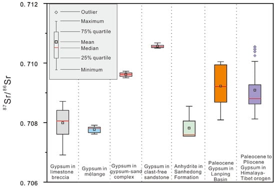 In situ 87Sr/86Sr compositions for gypsum/anhydrite and collected whole-rock Sr isotopes for gypsum in the Paleocene Yunlong Formation of the Lanping Basin and Cenozoic basins of the northern part of the Himalayan–Tibetan orogen are presented in Figure 8 and Supplementary Table S1. The Upper Triassic Sanhedong Formation anhydrite displays homogeneous 87Sr/86Sr values, with a relatively narrow range from 0.707541 to 0.707967, which is similar to Triassic seawater [29,30].
