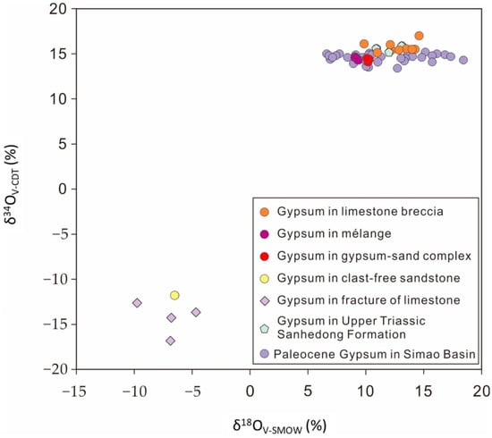 Plot of δ34S vs. δ18O values of different type gypsum in Jinding.