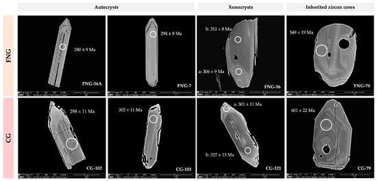 Back-scattered electron (BSE) images of distinct zircons collected in representative samples from FNG and CG with the corresponding analyzed spots and Concordia ages.