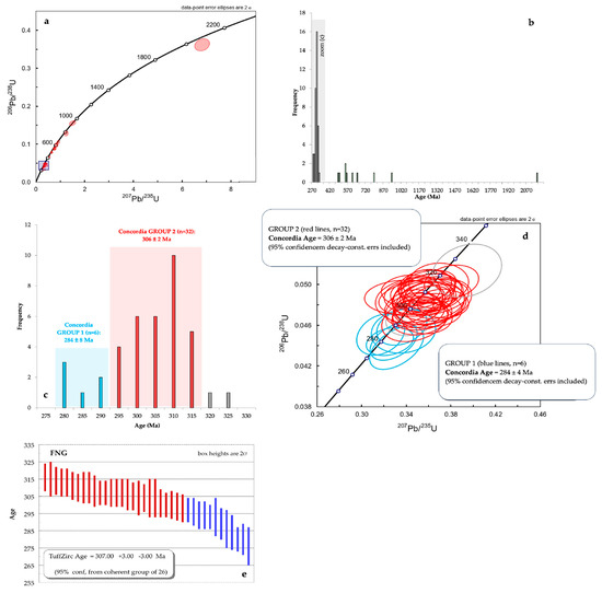 Thirty-eight concordant analyses, performed in zircon autocrysts, provided an apparent bimodal statistical distribution (Figure 4c), excluding the outlier of 323 Ma (zircon FNG-76a). The two identified subgroups (a1 and b1; Figure 4d) were then used in the determination of the following Concordia ages: 284 ± 4 Ma for the group a1 (n = 6, highlighted in blue) and 306 ± 2 Ma for the group a2 (n = 32, highlighted in red) (Figure 4c).