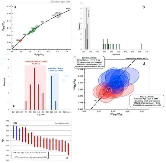 The analysis of the remaining 19 ages points to a bimodal distribution, subdividing the data into two main groups (Figure 5c): a younger group that yields a Concordia age of 301 ± 3 Ma (highlighted in red, Figure 5c,d), and an older group that yields a Concordia age of 317 ± 3 Ma (highlighted in blue, Figure 5c,d). Using the TuffZirc algorithm of [], a weighted average age of 303.5 (+10.5/−4.5) Ma was obtained for a coherent group of 16 zircons (Figure 5e).
