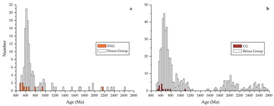 The distributions of 206Pb/238U and 207Pb/206Pb ages of the inherited zircon cores of both FNG and CG show predominant Neoproterozoic age populations (Figure 4b and Figure 5b), with main clusters in the Cryogenian–Ediacaran and scarcity in the Tonian, as well as in older ages, making it clear that there is a strong record of Pan-African and Cadomian major episodes of zircon crystallization, e.g., [,] and references therein. The presence of inherited zircon cores of upper Cambrian ages was only recognized in FNG. With the exception of these latter ages, the other ages show a general overlap with geochronology data from detrital zircons of metasedimentary formations equivalent to the FNG and CG wall rocks (Figure 7a). Examples of this similarity in the Precambrian inheritance include the Ediacaran metapelitic sediments from the Douro Group (northern CIZ autochthonous domain) [,], the late Ediacaran metagreywackes of the Penacova area [,] and, to a lesser extent, of the Sabugal region [], both belonging to the Beiras Supergroup (Figure 7b). The similitude is extensible to the southern CIZ metasediments from Spain, which are characterized by a high percentage of 690 to 540 Ma ages [] (Figure 7b). Therefore, considering the existing U–Pb data, it is admissible to infer that these metasediments can be considered potential sources of the inherited zircon cores recorded in FNG and CG.