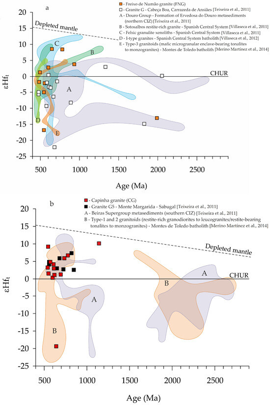 - Teixeira, R.J.S.; Neiva, A.M.R.; Silva, P.B.; Gomes, M.E.P.; Andersen, T.; Ramos, J.M.F. Combined U–Pb geochronology and Lu–Hf isotope systematics by LAM–ICPMS of zircons from granites and metasedimentary rocks of Carrazeda de Ansiães and Sabugal areas, Portugal, to constrain granite sources. Lithos 2011, 125, 321–334. [Google Scholar] [CrossRef]