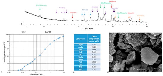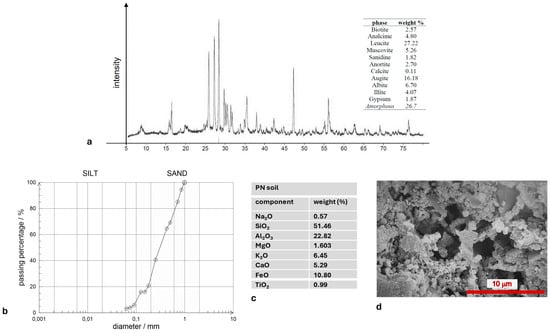 Figure 2a). Monteforte soil mainly contains amorphous phases with small amounts of quartz, kaolinite, anorthite, and muscovite/illite. In terms of grain size distribution, MF soil is a silty sand (