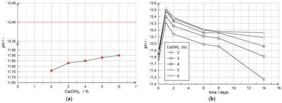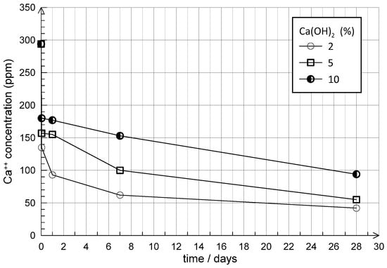 Figure 5a). As no ion-exchanging minerals (i.e., clay minerals and zeolites) are present, the consumption of calcium ions is consistent with the development of pozzolanic reactions in the very short term. The subsequent attainment of the target pH value results from the ionic dissociation of excess lime in the system. Measurements of pH at increasing curing times (
