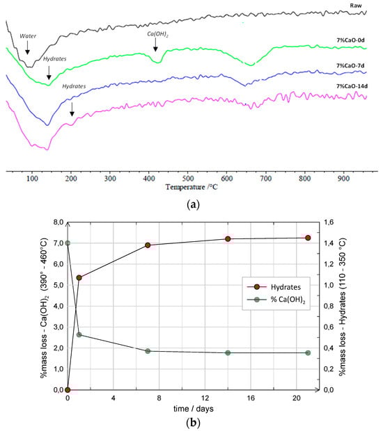 18] subjected MF samples prepared at 7% CaO to thermogravimetric analyses at increasing times (i.e., 24 h, 7 d, 14 d). From the DTG results, shown in