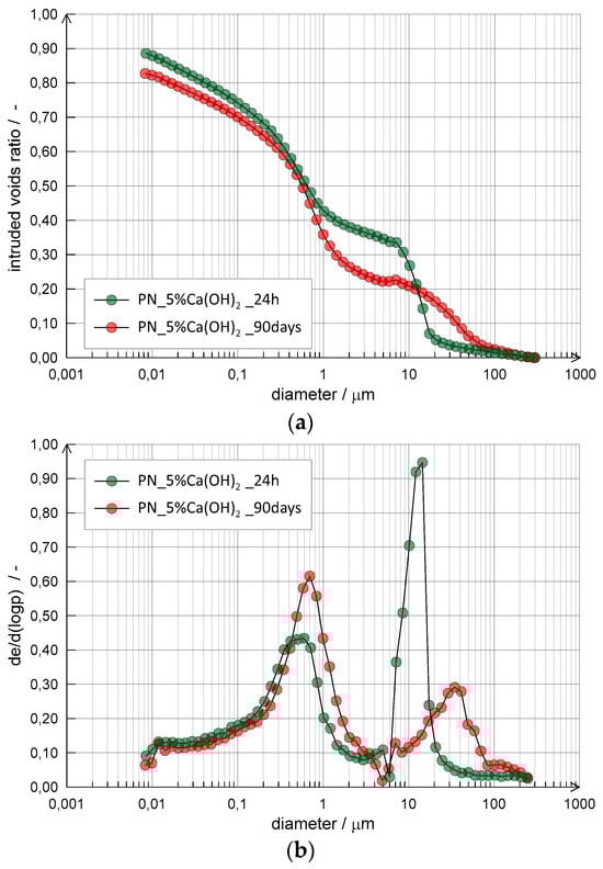 Figure 7a), indicating the absence of microstructural reorganisation of the samples. The lower pore frequency observed in the long term for each of the modal dimensions is consistent with the precipitation of hydrated gels on the surface of solid particles, reducing the pores’ accessibility. The reduction in total porosity in the long term is also shown by the cumulative intrusion curves plotted in
