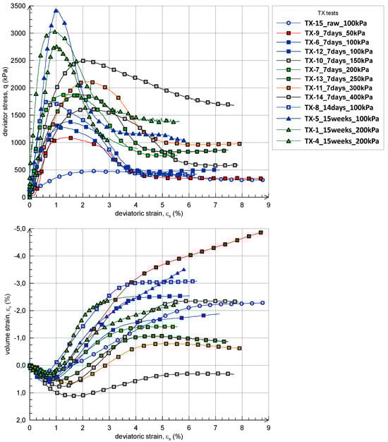 The results clearly highlight the expected effect of confining stress and curing time on the stress–strain behaviour. At low stress level (50 kPa) and a 7-day curing time, the brittle behaviour of PN soil—associated with soil dilatancy (i.e., negative volume strains)—is indicated by an abrupt decrease in deviator stress, which occurs immediately after the peak strength mobilization. The observed brittle behaviour is reduced as confining stress increases. On the other hand, the stress–strain behaviour for raw, not-treated PN soil is undoubtedly ductile, even if it is still associated with positive volume strains (blue open circles in