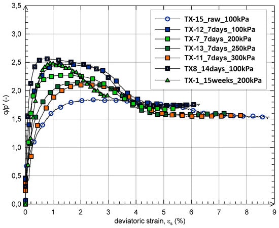 Figure 9). For samples cured for very long times (i.e., 105 days), whose shear strength is certainly increased due to the formation of cementitious compounds in the long term, the behaviour is systematically fragile and dilatant, independent of the applied stress level.