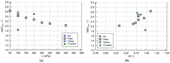 Figure 11a as a function of the effective radial stress, σ′. As mentioned before, the results unquestionably suggest that the brittleness of the material decreases with the applied stress level. As expected, for a given stress level, the larger the curing time, the larger the mobilized peak friction angle. The role of curing time is also investigated in terms of soil dilatancy behaviour (see