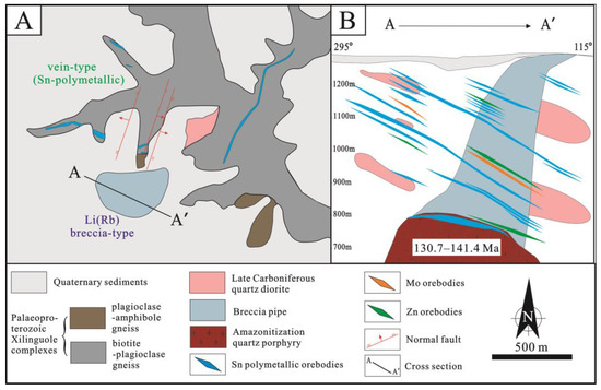 (A) Simplified geological map of the Weilasituo Li–polymetallic deposit (modified from [28]); (B) Cross-section of the crypto-explosive breccia-type Li deposit along the Weilasituo exploration line AA’ (modified from [15]).