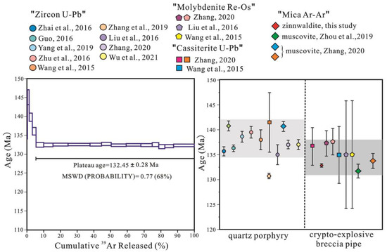 Previous studies have conducted in-depth research on the chronology of ore-forming rock masses. This study focused on 40Ar/39Ar dating of zinnwaldite in the breccia pipe. Previous studies determined that the age of the quartz porphyry was 130.7–141.4 Ma [15,17,18,19,20,21,22,23,24]. A particularly young age is likely to be derived from minerals that have been generated later and are not representative. Excluding relatively low-age data, the magma rock age was mainly concentrated at 135–141 Ma (Figure 4). The 40Ar/39Ar age of mica should be used with caution because the closure temperature of the system is low and can be easily modified by hydrothermal events in the later stages of mineralisation, which makes the age results unreliable [22]. The 40Ar/39Ar ages from this study of zinnwaldite are consistent with results obtained from previous geochronological studies of other minerals (cassiterite, molybdenite, and muscovite; 133.7 ± 1.5 Ma to 137.3 ± 2.5 Ma; [19,22,53]) in the pipe within the error range, indicating that the 40Ar/39Ar age of zinnwaldite is reliable and represents the time of ore-forming events. As the ore-bearing mineral of the deposit, the plateau age of zinnwaldite indicates Li mineralisation at 132.45 ± 1.3 Ma. Based on the previous age data (Figure 4), we concluded that the ages of some cassiterite and molybdenite in the crypto-explosive breccia pipe (136.8 ± 3.8 Ma to 137.3 ± 2.5 Ma; [22]) were the same as those of the ore-forming rock mass; some cassiterite and molybdenite (135 ± 5.8 Ma to 135 ± 11 Ma; [19,22]) are formed before the formation of zinnwaldite after quartz porphyry, and the age of the mica minerals was slightly later, suggesting that the zinnwaldite truly formed and was enriched after the molybdenite and cassiterite. Zhang (2020) showed that 133.7 ± 1.5 Ma is the cooling age of muscovite formed in the breccia pipe, which is closely associated with cassiterite. The cooling age of zinnwaldite is slightly later than that of muscovite, indicating that the Li mineralisation time may be between 133.7 ± 1.5 Ma and 132.45 ± 1.3 Ma. This chronological study confirmed that the age of Li mineralisation was in the Early Cretaceous, which showed that the rock mass closely related to Li–polymetallic mineralisation in this area was quartz porphyry from the late Yanshan period. Moreover, Sn polymetallic mineralisation in this area occurred close to the time of Li–polymetallic mineralisation, indicating that the two may have a close genetic relationship.