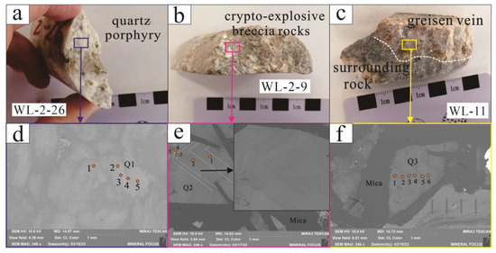 Based on the geological characteristics of the deposit, we analysed the trace elements of quartz and mica in three stages: quartz porphyry, crypto-explosive breccia pipes, and greisen veins. Using the SEM-CL images of the thin sections, the trace element dotting locations were determined at three stages in the Weilasituo Li deposit (Figure 5).