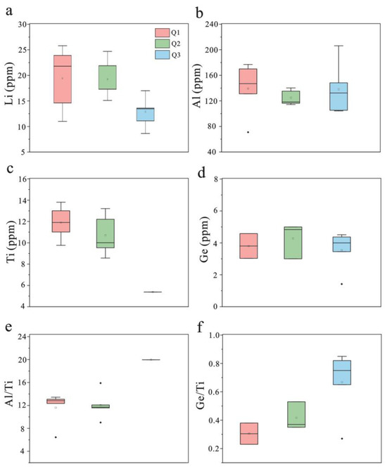 Trace element box plot of quartz in each stage of the Weilasituo Li–polymetallic deposit. (a) Li content in Q1–Q3; (b) Al content in Q1-Q3; (c) Ti content in Q1-Q3; (d) Ge content in Q1–Q3; (e) Al/Ti ratio in Q1–Q3; (f) Ge/Ti ratio in Q1-Q3.