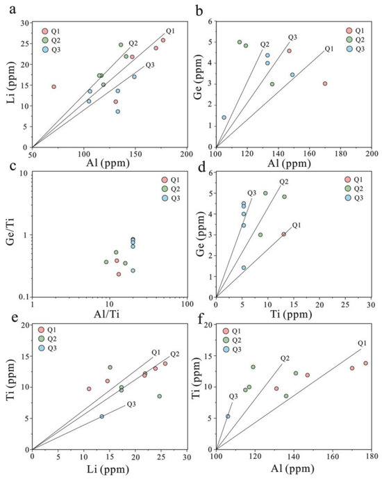 The elements most sensitive to magmatic differentiation were Li, Rb, Al, Ge, Ti, and Sn, and the degree of magmatic differentiation can be illustrated by Al-Ti, Ge-Ti, or Li-Ti diagrams in quartz [76,87,89,90,91,92,93]. The Al/Ti, Ge/Ti, and Li/Ti ratios reflect the degree of magmatic differentiation [71,84]. In Figure 7 and Figure 8, the changes in the Al-Ti, Ge-Ti, and Li-Ti diagrams and the increased Al/Ti and Ge/Ti ratios indicate that the degree of magmatic differentiation from Q1 to Q3 increased.