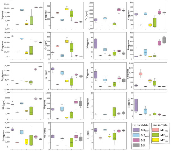 Trace element box plot of mica in each stage of the Weilasituo Li–polymetallic deposit. Muscovite: M1YEL, M2YEL, and M2BLU; zinnwaldite: M1RED, M2RED, M3, M4.