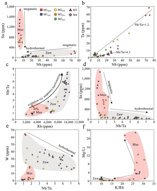 Evaluation of mica chemistry: (a) Sn vs. Nb—distributions of Nb and Sn in mica are independent. Nb (and Ta) are preferentially enriched in magmatic mica from the porphyry, while muscovite is rich in Sn. (b) Ta vs. Nb; (c) Nb/Ta vs. Rb; (d) Sn vs. Nb/Ta; (e) W vs. Nb/Ta; (f) Mg/Li vs. K/Rb.