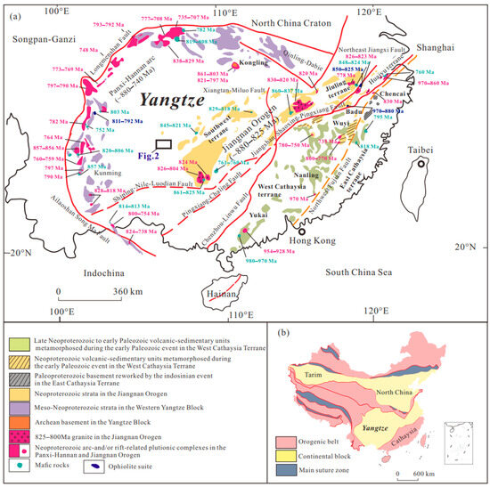“Rodinia” refers to a supercontinent that existed during the late Mesoproterozoic to the early Neoproterozoic era, but its geographical boundaries and precise evolutionary timelines are still undetermined. Consequently, there is ongoing debate regarding the timing of Rodinia’s assembly and breakup. It is generally believed that, around 820 Ma, Rodinia transitioned from a phase of amalgamation to fragmentation. The breakdown of the supercontinent involved multiple distinct phases and stages [1,2,3]. The Yangtze Block, a significant component of China’s Precambrian crust [4,5], was once part of Rodinia and thus offers crucial insights into the supercontinent’s evolutionary history. Previous isotopic geochronology studies on various Precambrian rock types exposed in the Yangtze Block (Figure 1) provide essential scientific data for clarifying the complete evolutionary history of Rodinia.