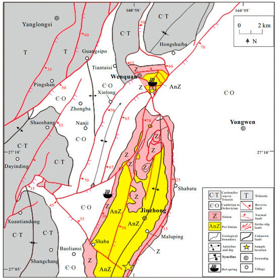 - Wang, J.L.; Lin, F.C.; Hou, L.; Zhang, J.R.; Peng, Z.; Zhu, S.B.; Wu, S.Y. Characteristics and metallogenic significance of fluid inclusions in the Nibao gold deposit, Guizhou. Bull. Mineral. Petrol. Geochem. 2014, 33, 688–699. (In Chinese) [Google Scholar] [CrossRef]