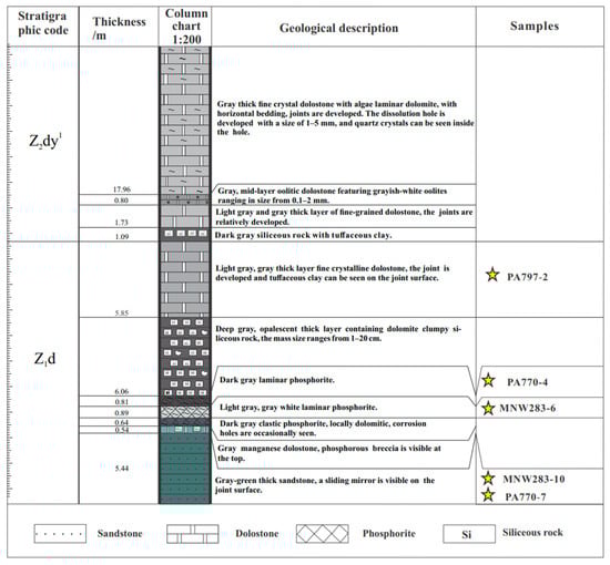 Stratigraphic column diagram illustrating the phosphorite-bearing rocks in the Kaiyang area of Guizhou, from the Doushantuo Formation to the overlying Dengying Formation. The yellow asterisks denote the following sampled intervals: PA797-2 for top dolostone, PA770-4 and MNW283-6 for phosphorite rock, and MNW283-10 and PA770-7 for basal sandstone.