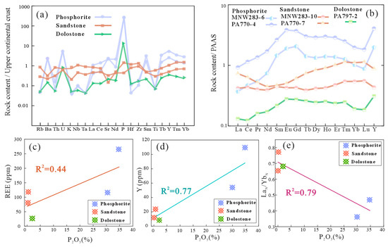 Diagrams illustrating the whole-rock geochemical compositions for the Kaiyang phosphorite-bearing rocks. (a) A trace element spider diagram normalized to the upper continental crust values (data referenced from [25]); (b) rare earth element normalized distribution pattern diagram (PAAS-normalized data from [26]); (c) correlation chart of the P2O5 and total REE content; (d) correlation chart of the P2O5 and Y content; and (e) correlation chart of the P2O5 content and LaN/YbN ratio.