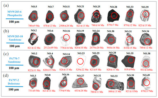 In the phosphorite sample MNW283-6, our analysis of 41 zircon grains yielded 35 valid data points. The ages of these grains spanned from 2508 to 594 Ma, with prominent age peaks at around 780 Ma, 820 Ma, and 880 Ma. The weighted mean 206Pb/238U ages of the three peak groups were 877 ± 3 Ma (N = 13, MSWD = 3.30); 825 ± 4 Ma (N = 8, MSWD = 0.59); and 777 ± 4 Ma (N = 8, MSWD = 0.19) (Figure 8a,b). The oldest and youngest zircons in the aforementioned sample registered at 207Pb/206Pb ages of 2508 ± 28 Ma and 1837 ± 29 Ma, and 206Pb/238U ages of 651 ± 29 Ma and 594 ± 9 Ma, respectively. The Th/U ratios ranged from 0.33 to 1.57 (Figure 8d).