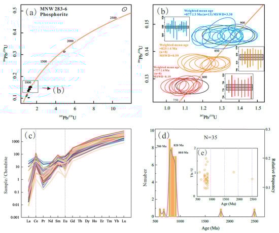 Phosphorite sample MNW283-6 zircon U-Pb age-analysis-related diagrams. (a,b) Concordia diagrams; (c) chondrite-normalized REE distribution pattern diagram (C1 chondrite normalization data from [27]); (d) U-Pb age histograms and the relative probability plots; and (e) correlation diagrams of the zircon ages and Th/U ratio diagram. The 206Pb/238U ages were selected for zircons younger than 1000 Ma, while 207Pb/206Pb ages were used for zircons older than 1000 Ma.