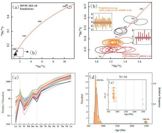 In the basal sandstone sample MNW283-10, we retained 36 valid data points, with ages ranging from 2512 Ma to 777 Ma and two marked peaks around 820 Ma and 780 Ma. The weighted mean 206Pb/238U ages of the two peak groups were 819 ± 2 Ma (N = 19, MSWD = 0.30) and 779 ± 4 Ma (N = 7, MSWD = 1.40) (Figure 9a,b). Additionally, two zircon grains recorded ages of 2512 ± 49 Ma and 2479 ± 20 Ma. The Th/U ratios for all measured zircons ranged from 0.39 to 1.47 (Figure 9d).