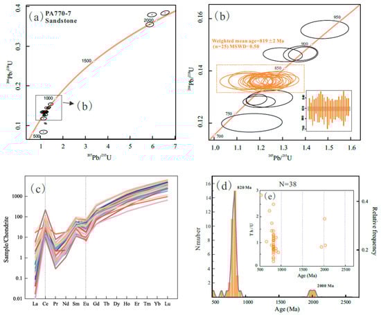 Sandstone sample PA770-7 zircon U-Pb age analysis-related diagrams. (a,b) Zircon concordia diagrams; (c) zircon chondrite-normalized REE distribution pattern diagram (C1 chondrite normalization data from [27]); (d) U-Pb age histograms and the relative probability plots; and (e) correlation diagrams of the zircon ages and Th/U ratio diagram. 206Pb/238U ages were selected for zircons younger than 1000 Ma, while 207Pb/206Pb ages were used for zircons older than 1000 Ma.
