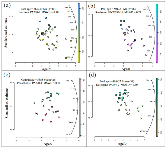 Kaiyang phosphorite-bearing rock single grain standard deviation and age variance radiograph: (a) Basal sandstone, PA770-7; (b) Basal sandstone, MNW283-10; (c) Phosphorite, PA770-4; (d) Top dolostone, PA797-2.