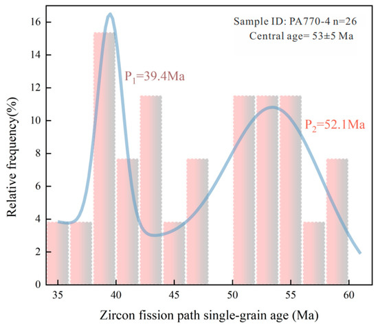 For samples meeting the chi-square standard (Pχ2 > 5%), age pooling yielded a consolidated ZFT age. However, for samples like PA770-4 (phosphorite), which fall below the chi-square threshold, it becomes essential to categorize the grain ages into discrete clusters, apply the central age (central age) for the sample’s fission-track age, and utilize the Zeta calibration endorsed by the International Union of Geological Sciences (IUGS) (this investigation adopted a Zeta value of 88.2 ± 2.9 [31]).