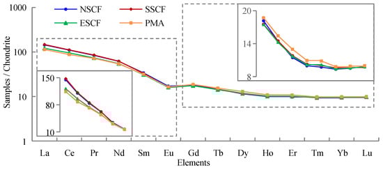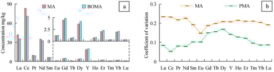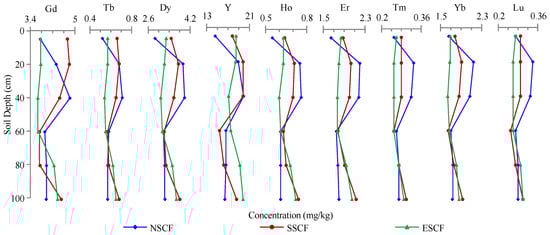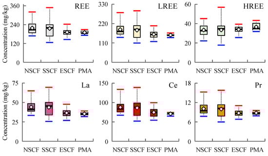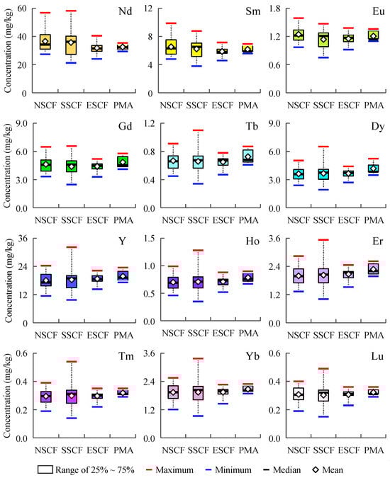 - The REE concentration in the soil of the Rujigou Coal Mine was about 216.09 mg/kg, of which LREE is 84.55%. The sum of REEs and LREEs were lower in PMA than MA, but ΣHREE is higher. The sum of REE in SSCF was similar to NSCF and higher than ESCF. Coal combustion can contribute to LREE enrichment to some extent, while HREE may be depleted in the process.