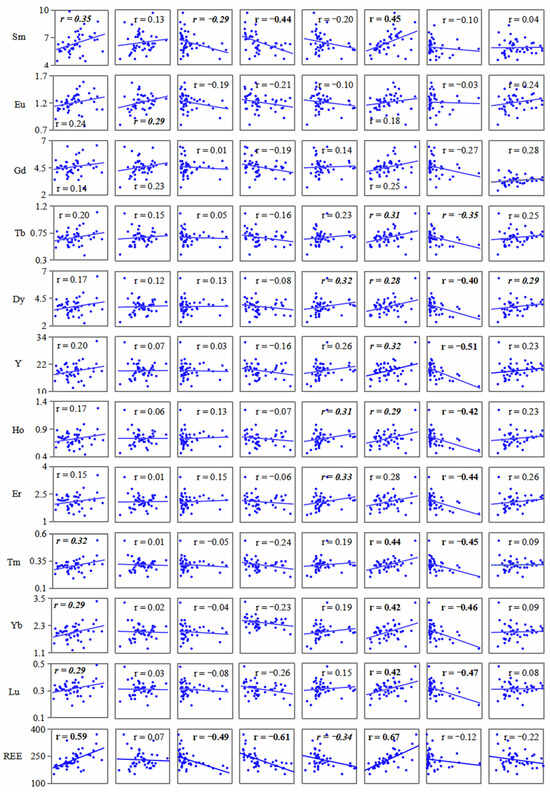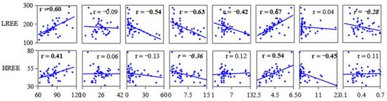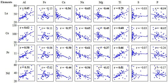 - Aluminum and Ti might have the same material source as REEs, especially LREEs, because they have similar geochemical behavior. Sulfur and Fe had a negligible relation with the enrichment and distribution of REEs, while Ca, Na, and Mg had a negative correlation with LREEs.