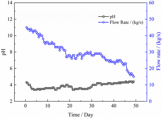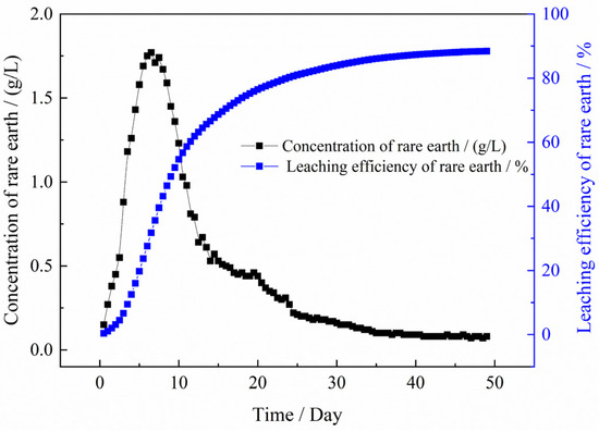 25]. When an excessive amount of acidic leaching agent is added to the ore body, the pH of the leaching solution decreases and is maintained between 3 and 5. During this time, an exchange reaction occurs between the leaching agent cation and rare earth ion, resulting in the collection of a leaching solution containing rare earth. Moreover, the flow rate exhibited a gradual decline throughout the leaching process. From days 20 to 40, the trend was relatively steady with minor fluctuations, while towards the end of the leaching process, the flow rate diminished considerably. The leaching liquid flow rate is related to the amount of leaching agent solution. At the beginning of leaching, leaching agent solution is added according to a certain liquid–solid ratio, resulting in a high leaching liquid flow rate. After the leaching agent solution is added proportionally, the injection stops, leading to a gradual decrease in the flow rate of the leaching solution as the leaching cycle progresses.