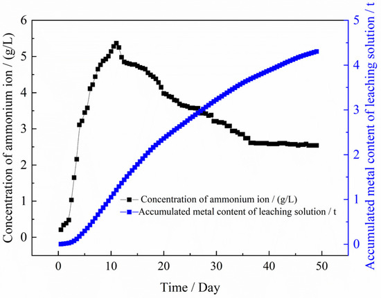 Figure 4, during the 50-day leaching period, the concentration of ammonium ions peaked on the 10th day of the leaching process, followed by a gradual decrease, ultimately stabilizing towards the end. Upon the completion of leaching, the accumulated metal content in the leaching solution reached 4.44 tons. The content of ammonium ions is related to the amount of leaching agent. With the addition of a leaching agent solution, some ammonium ions and rare earth ions are adsorbed by clay minerals in a large amount of ammonium ion leached ore body. Most ammonium ions percolate into the solution and finally reach the outlet. During the injection period, most of the ammonium ions were collected simultaneously with the rare earth leaching solution, and the ammonium ions in the leaching solution increased rapidly. When the liquid injection is stopped, the residual ammonium ions in the ore body are collected after percolating with the solution, and the ammonium ions gradually decrease.