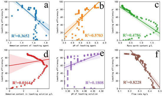 Figure 5a–f, respectively, depict scatter diagrams representing the relationship between leaching agent ammonium content and leaching efficiency, leaching agent pH and leaching efficiency, rare earth content and leaching efficiency, leaching solution ammonium content and leaching efficiency, leaching solution pH and leaching efficiency, and flow rate and leaching efficiency. In