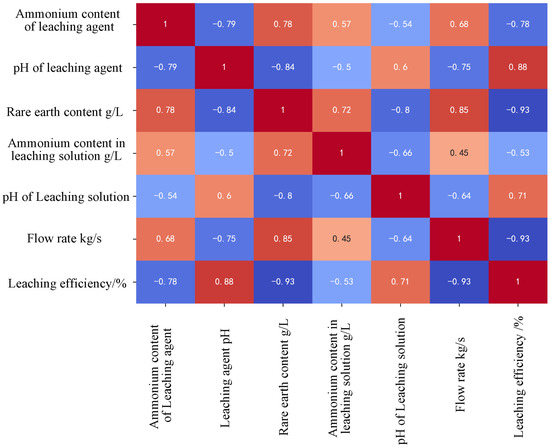 2 value. To further evaluate the strength of correlation among the condition variables, excluding the flow rate of the leaching solution, and leaching efficiency, we selected the correlation coefficient as a numerical indicator to assess the extent of influence of each variable on the leaching efficiency outcomes during the heap leaching process of rare earth ore, thereby quantifying the degree of correlation.