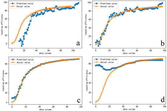 Figure 7, panels a, b, c, and d compare the actual leaching efficiency values with the predicted leaching efficiency indices of the OLS model, linear regression model, random forest model, and SVR model, respectively. In each panel, the horizontal axis represents the number of data points involved in verification, while the vertical axis represents the leaching efficiency value. The blue line represents the index predicted by the model after training, and the orange line represents the actual value. It is evident from the figure that the random forest model exhibits the best-fitting degree, consistent with the analysis of evaluation indicators such as MSE and R