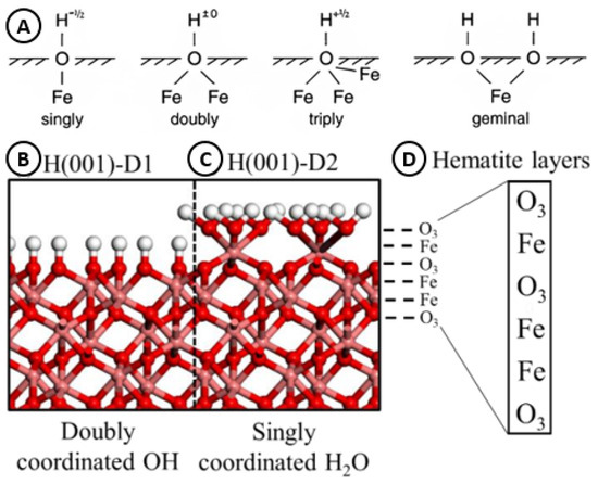 Hydroxyl groups coordination onto hematite exposed atoms (A). Molecular and crystal structures: (B) hematite (001)-D1 surface domain; (C) hematite (001)-D2 surface domain; (D) order atoms organization in the hematite crystal structure layers. Atom color code: hydrogen—white, oxygen—red, iron—pink [19,20,21,22].