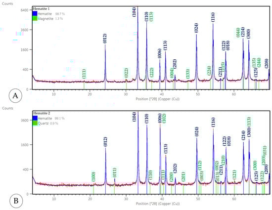 XRD spectra with Rietveld refinement semi-quantitative analysis for the high-purity hematite samples: (A) Hematite-1 (blue peaks) showing the main CPO (012), (104), (110), (006), (113), (202), (024), (116), (211), (122), (018), (214), (300), (125), (208) and magnetite (green peaks) showing the main CPO (111), (022), (113), (222), (004), (133), (224), (115), (044), (135), (244); (B) Hematite-2 (blue peaks) showing the main CPO (012), (104), (110), (006), (113), (202), (024), (116), (211), (122), (018), (214), (300), (125), (208) and quartz (green peaks) showing the main CPO (100), (011), (110), (102), (111), (200), (201), (112), (003), (002), (013), (210), (121), (113), (300), (122), (203), 031).