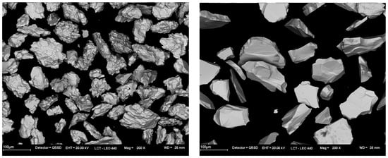 SEM images 200× magnification illustrating the differences in shape between Hematite-1 (on the left) and Hematite-2 (on the right) on the −106 + 44 µm particle size fraction.