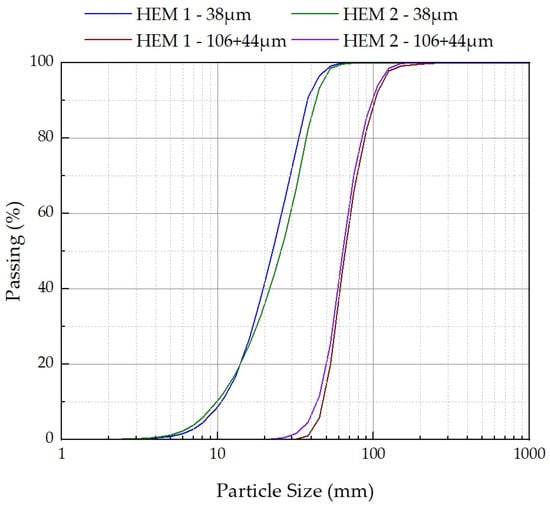 Bulk quantitative chemical analysis of the coarse and fine fractions of Hematite-1 (H-1-C, H-1-F) and Hematite-2 (H-2-C, H-2-F) was performed by XRF (Malvern Panalytical Zetium X-ray fluorescence spectrometer) (Malvern Panalytical, Worcestershire, UK) by using a lithium tetraborate fusion flux. Calibrations are related to the quantitative analysis by the comparison with certified references. The loss by ignition (LI) was performed by exposing the samples to heat (1020 °C) for 2 h in the oven. Further qualitative and semi-quantitative analysis of chemical elements found in the two different types of hematite raw particles (−106 + 44 µm) and the polished sections mounted on stubs and carbon coated were detected by Scanning Electron Microscopy (SEM) using the energy dispersion detector (EDS) INCA x-act (Oxford Instruments, Abingdon, UK) coupled with the microscope model Stereoscan 440 (LEO) (Leica Cambridge, Ltd., West Midlands, UK).