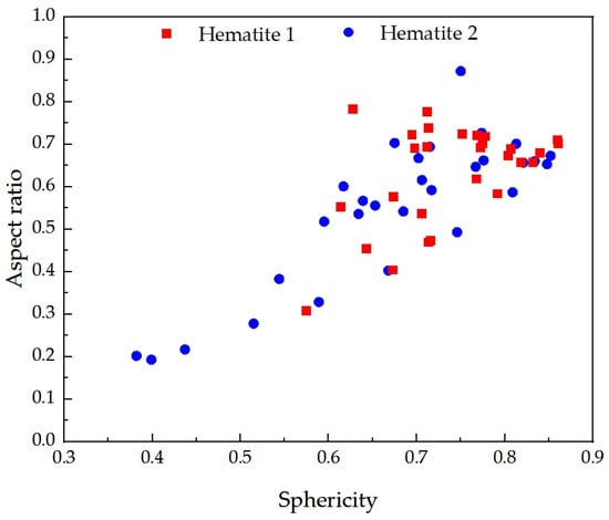 Particle sphericity () versus aspect ratio (AR) of the coarser fraction (−106 + 44 µm) of Hematite-1 (H-1-C) versus Hematite-2 (H-2-C) are presented in Figure 7. According to the classification maintained by many authors [2,33,34], those results demonstrate that particles of either Hematite-1 or Hematite-2 show similar average values of medium sphericity, for Hematite-1 versus for Hematite-2. However, Hematite-2 shows 12% of its particles in the angular to sub-angular aspect ratio range (0.2 to 0.5) and most of its particles in the sub-angular range, while Hematite-1 shows 50% of its particles with the rounded aspect (0.7 to 0.8 aspect ratio) and 50% in the sub-angular aspect. These results showed that, despite similarities in the sphericity statistical average, a population of particles with very low roundness and elongated shape for Hematite-2 was observed, whereas the Hematite-1 showed more congruent dimensions (Xcmin and XFemax), resulting in more rounded shapes. Although results yielded by Camsizer point out a high bulk average sphericity value for Hematite-2, the value can be addressed to the shape of a hexahedron, according to Souza Pinto and co-workers [6], while found for Hematite-1 may be referred to an octahedron. Therefore, once the hexahedron is composed of oriented planes, including the (001), the results yielded by Camsizer agree with the XRD, morphology, and texture analysis previously shown in this paper.